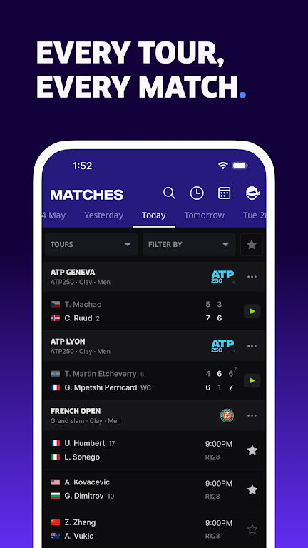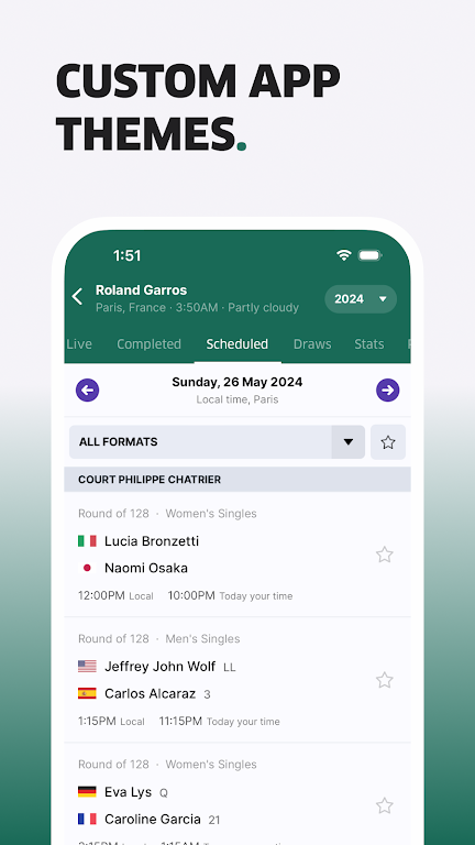 - Select your favorite players and matches to receive real-time scores, news, and schedules that interest you the most.