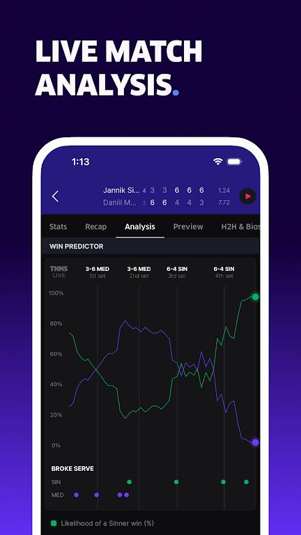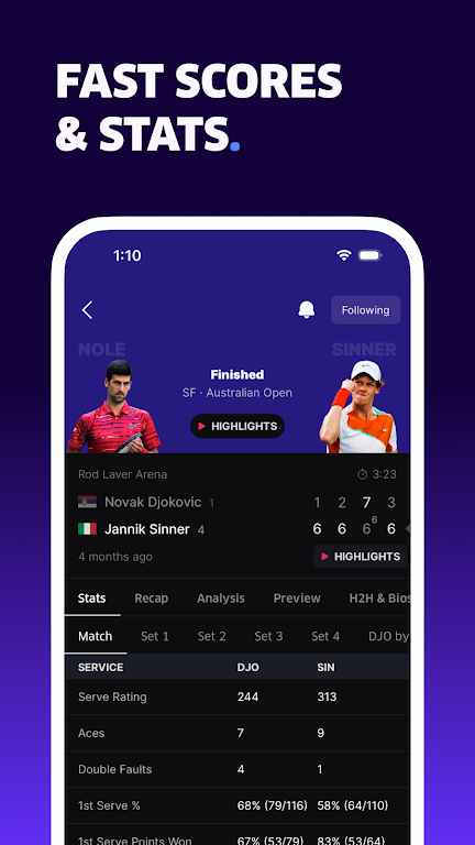- Customize push notifications for individual matches and favorite players to get updates on breaks of serve, final results, retirements, and more.
