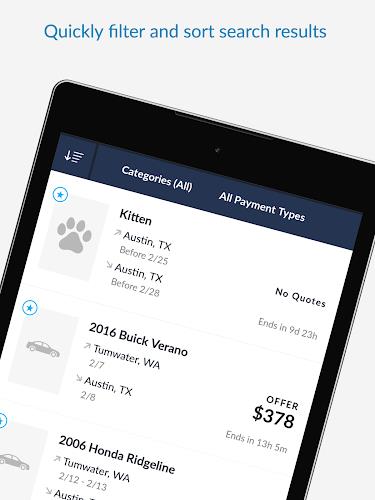 Streamline your transportation marketplace experience with the official Android app from uShip! Whether you're a service provider on the go or a shipper coordinating logistics, this app has everything you need at your fingertips. Service providers can easily find, bid on, and book shipments, maximizing their time on the road. Shippers can manage listings and communicate with providers effortlessly, ensuring smooth transactions. With features like saved searches, quick payment options, and seamless shipment management, uShip for Android simplifies the entire process. Download now and let us know how we can make your experience even better!
