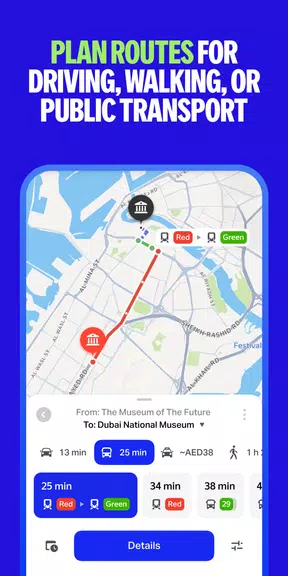 Detailed live map with accurate routes for driving, walking, and public transport