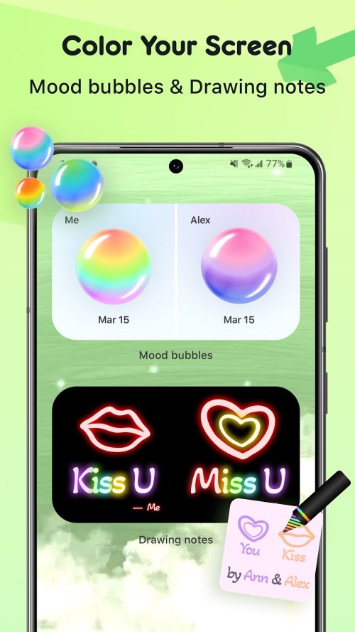 Soft, trend-forward visual themes that decorate the phone in calming colors; interactive virtual pets that reward regular attention and form a routine habit; a DIY garden system with diverse plant widgets that show real-time growth stages; customizable mood bubbles for nonverbal emotional expression; intimate social widgets that let you share moods and updates with people you trust; and straightforward privacy settings so your personal space stays private unless you invite others.