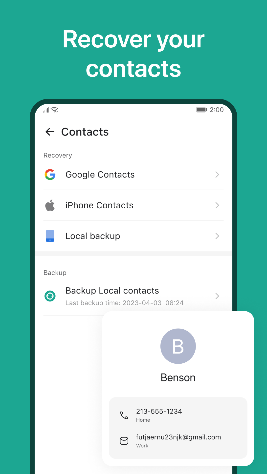 ⭐ Restore contacts and a wide range of file formats (.jpg, .mp4, .mp3, .doc, .txt, .zip) with original quality preserved.