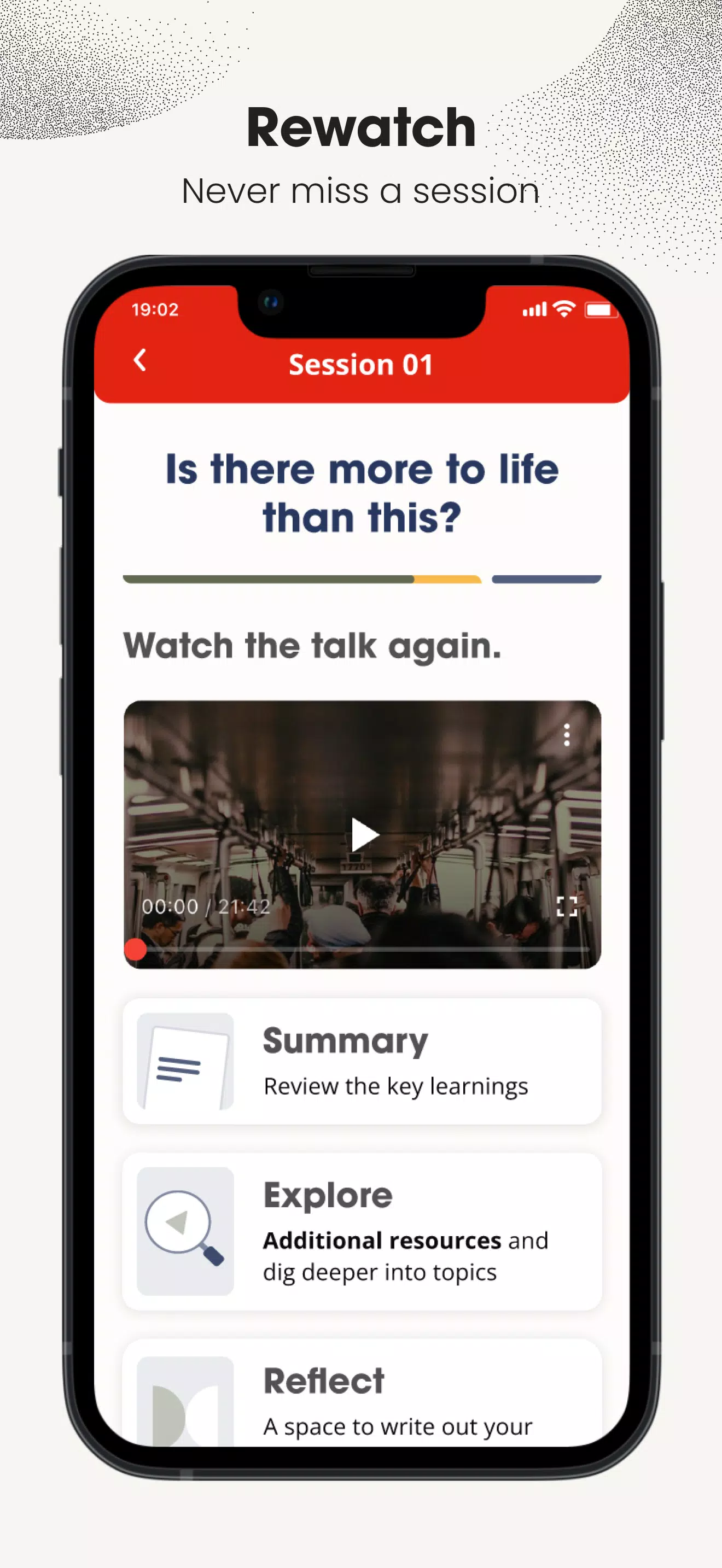 On-demand session videos and brief summaries make it easy to refresh main ideas, while weekly bonus content offers short films, suggested readings and curated online resources. Built-in reflection tools present discussion prompts and let you save private notes, and simple browsing helps you find past sessions and extras when you need them.