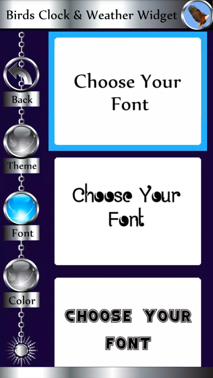The app provides an at-a-glance clock and local weather display for your home screen, using bird-themed icons and visuals to add personality. Adjustable widget sizes and simple layout options let you place and size the widget to fit different home screen arrangements. Basic customization for colors and fonts helps match the widget to your wallpaper, and the straightforward setup requires minimal configuration to get started.