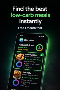 BizzyMenu uses on-device AI to scan printed or digital menus and identify items that fit low-carb and ketogenic guidelines. The app highlights the most suitable dish choices and provides quick recommendations to reduce guesswork when ordering. Scans typically complete in seconds, and new users can evaluate the app using the one-month free trial.