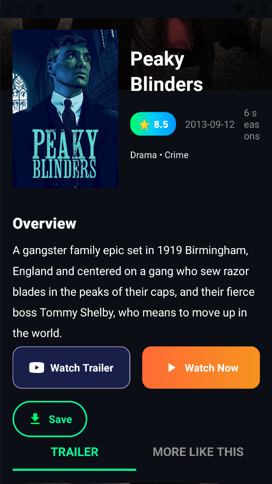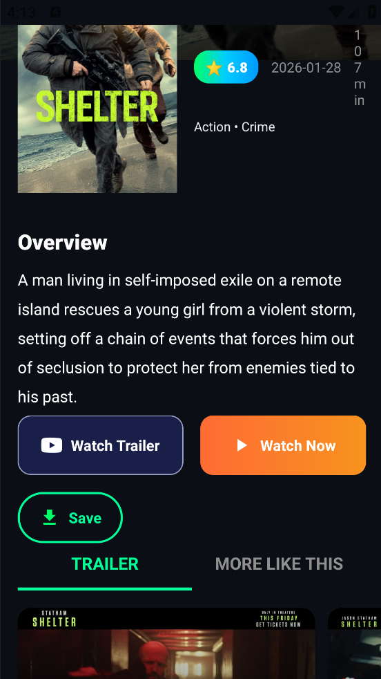 Browse thousands of movies and TV shows across genres such as Action, Romance and Sci‑Fi to discover new and classic titles, save favorites to a personalized My List, view comprehensive details including cast information, plot summaries, release dates and user ratings, and watch the latest trailers inside the app to preview content before deciding to watch a full episode or film.