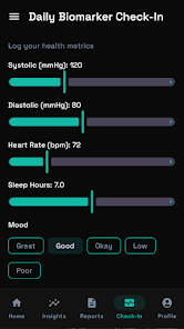 ⭐ Daily biomarker check-in lets you log vital metrics and maintain a continuous health journal to support longitudinal tracking.