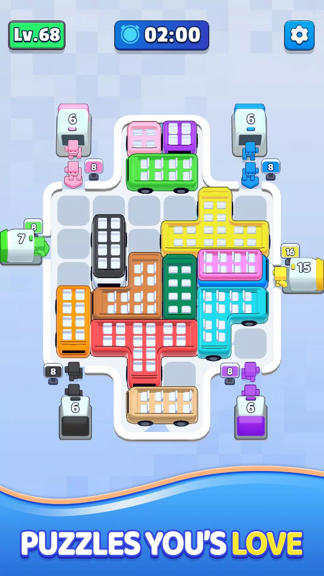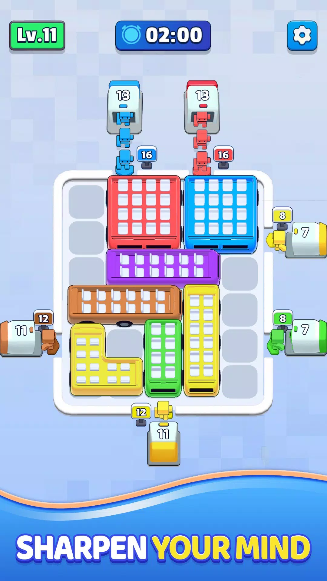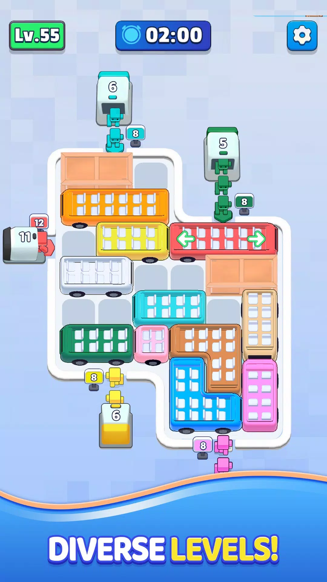 Color Matching Challenge: Players must strategically match buses with gates of the same color to fill and clear them from the board.