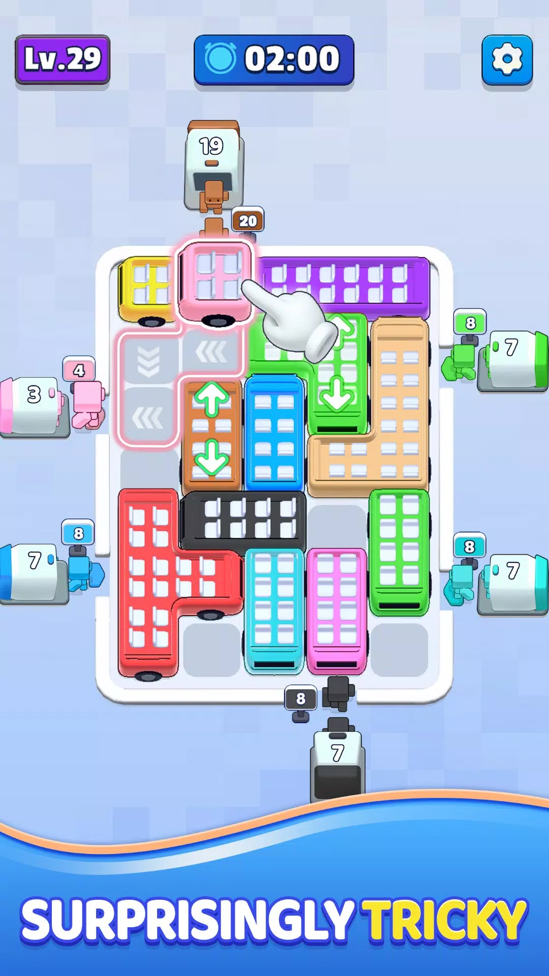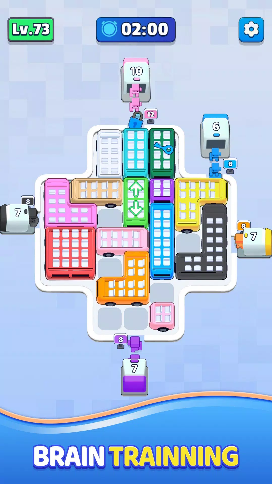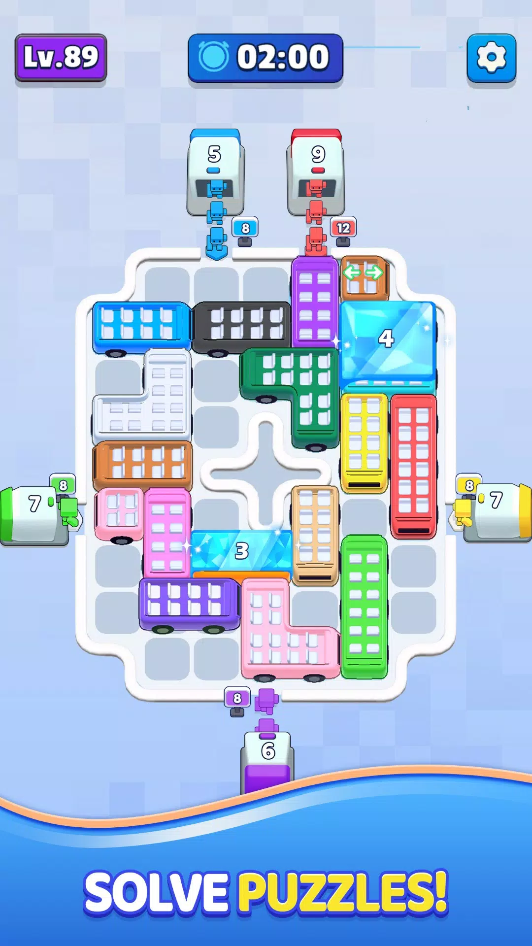 Color Matching Challenge: Players must strategically match buses with gates of the same color to fill and clear them from the board.