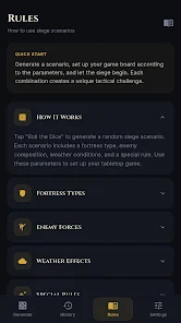 ⭐ Four-layer mechanics: Fortress Type, Enemy Forces, Weather Effects and Special Rules for varied encounters.
